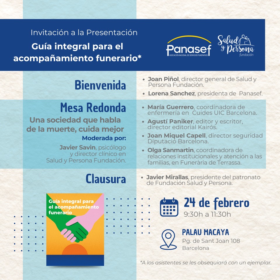 El próximo 24 de febrero, en colaboración con la Fundación Salud y Persona, presentamos la “Guía integral para el acompañamiento funerario” en el Palau Macaya de Barcelona. Una guía que pone en valor el trabajo de las empresas de servicios funerarios desde el punto de vista de la gestión emocional.